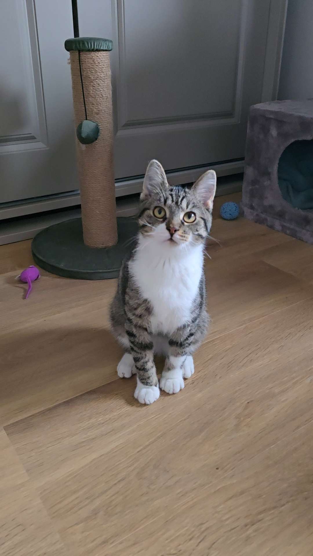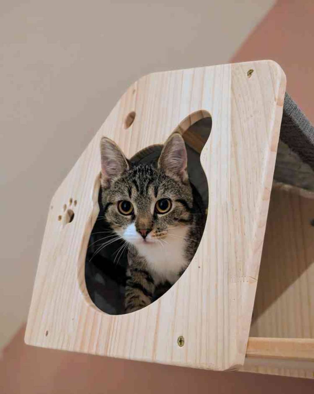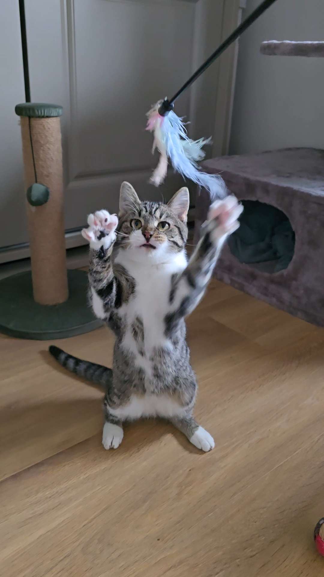 Verlanglijstje: ze zijn enorm blij met hun hogere krabpaal. Hun vaste hangplek en stoeiplek! Ze stoeien en springen er op los en slapen daarna heerlijk in de hangmandjes en op de plateaus.